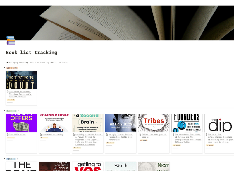 A book tracker for 2023, which include a list of recommended book to read in this year. Each book includes various features such as link, progress, status, category, and so on.